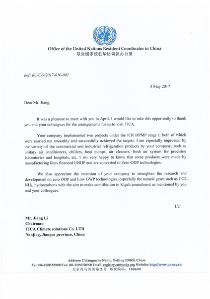5月3日,联合国驻华协调员兼联合国开发计划署(UNDP)驻华总代表罗世礼先生(Nicholas Rosellini)致信天加公司,对天加在4月时热情接待自己来访参观表示感谢,并高度赞扬了天加自然冷媒技术在保护臭氧层、减少温室气体排放上所做出的贡献。